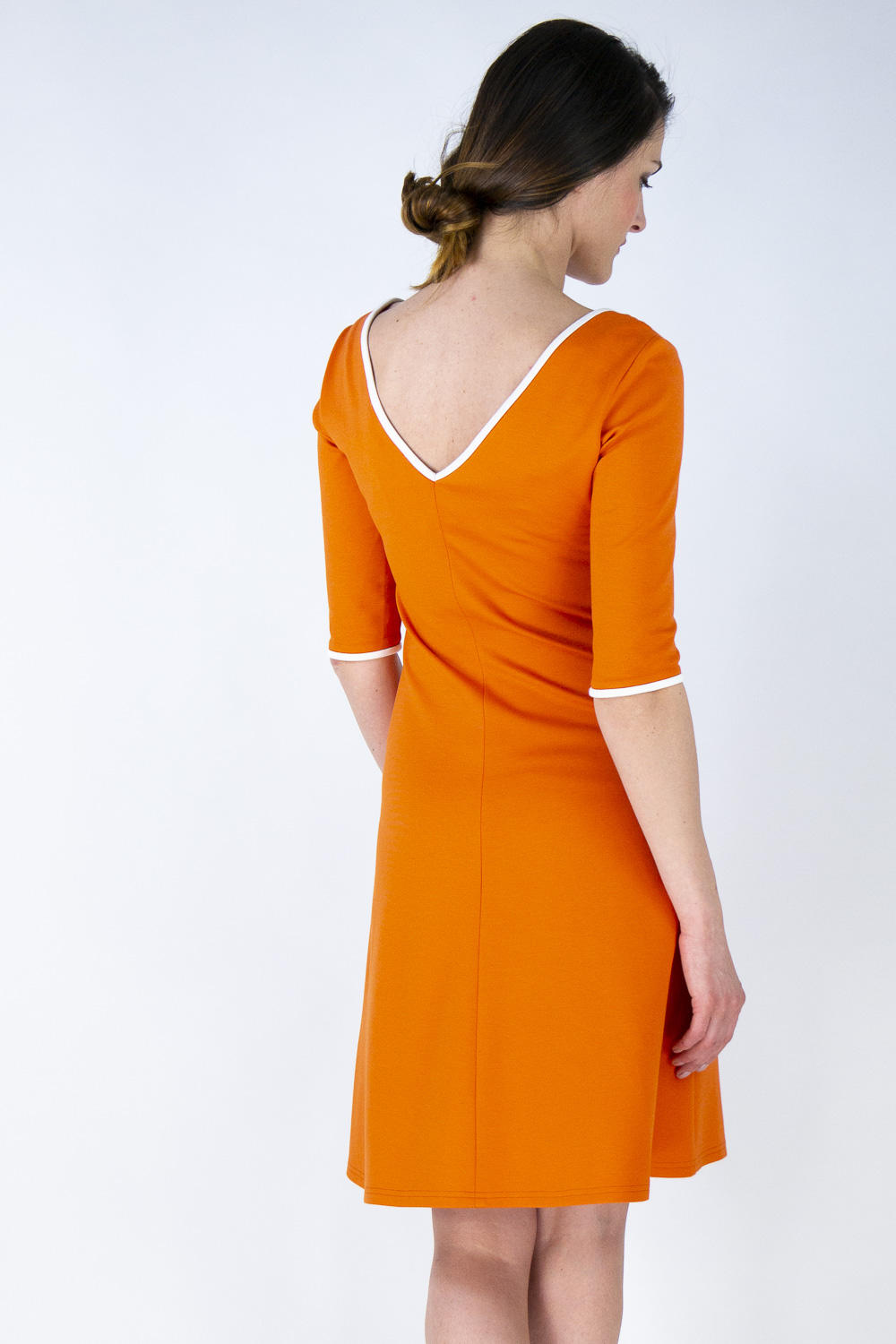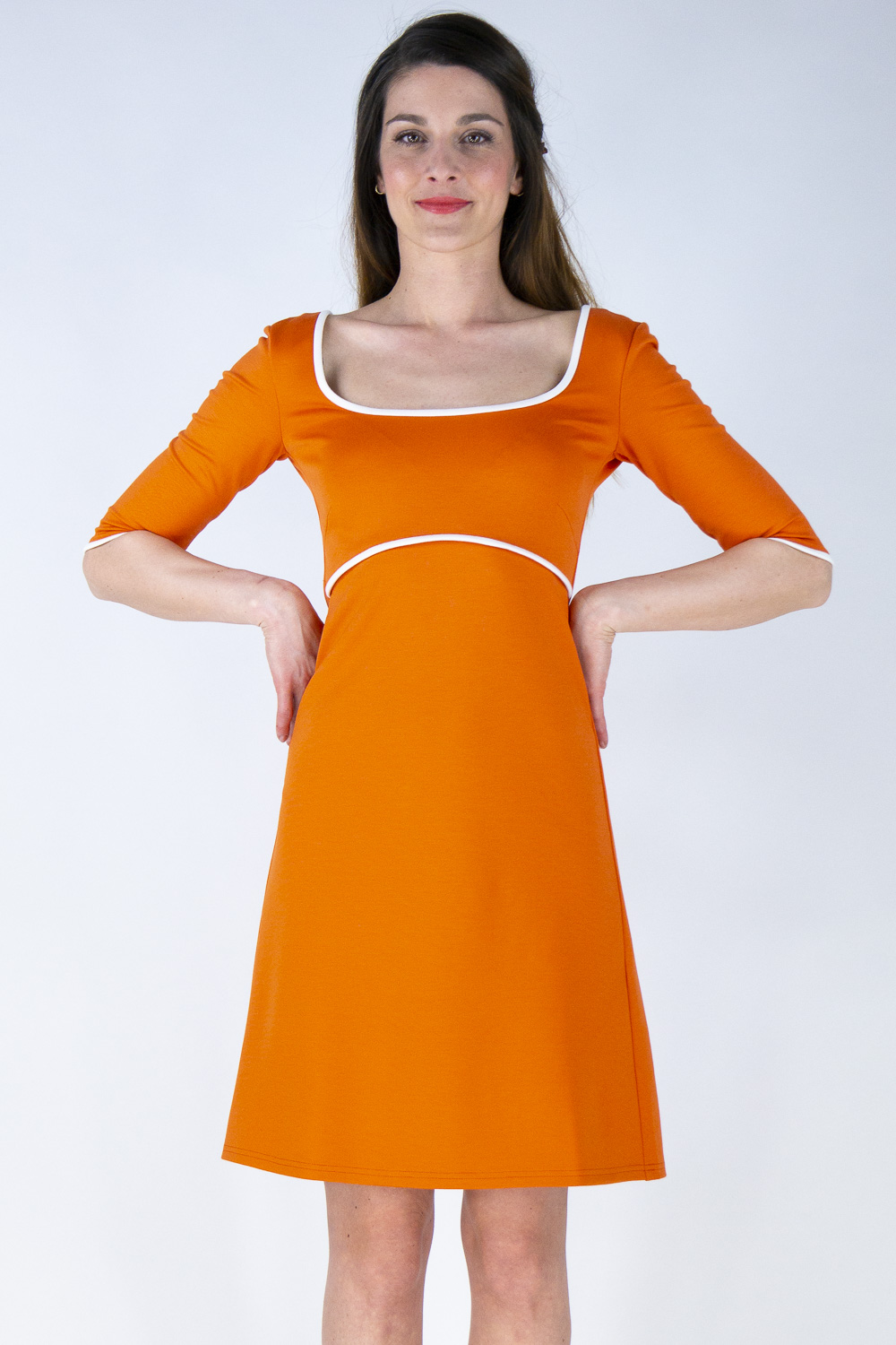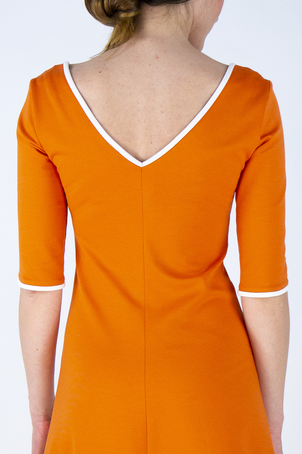 Die Taille rückt durch die Linie unter der Brust optisch nach oben und sorgt für lange Beine. Im Oberteil ist es anliegend, der Rock hat eine A-Linie. Der Ausschnitt ist großzügig, damit nichts verrutscht gibt es verdeckt eingearbeitete Clipse zur Befestigung am BH- Träger. Der Ausschnitt ist im Vorderteil eckig gearbeitet, im Rücken spitz zulaufend. Die Rückenpartie ist atemberaubend und zeigt viel Haut, der Ausschnitt endet jedoch vor der BH-Linie. Kombinieren Sie an kühlen Tagen einen unserer großzügigen Loopschals und Wendestulpen dazu.