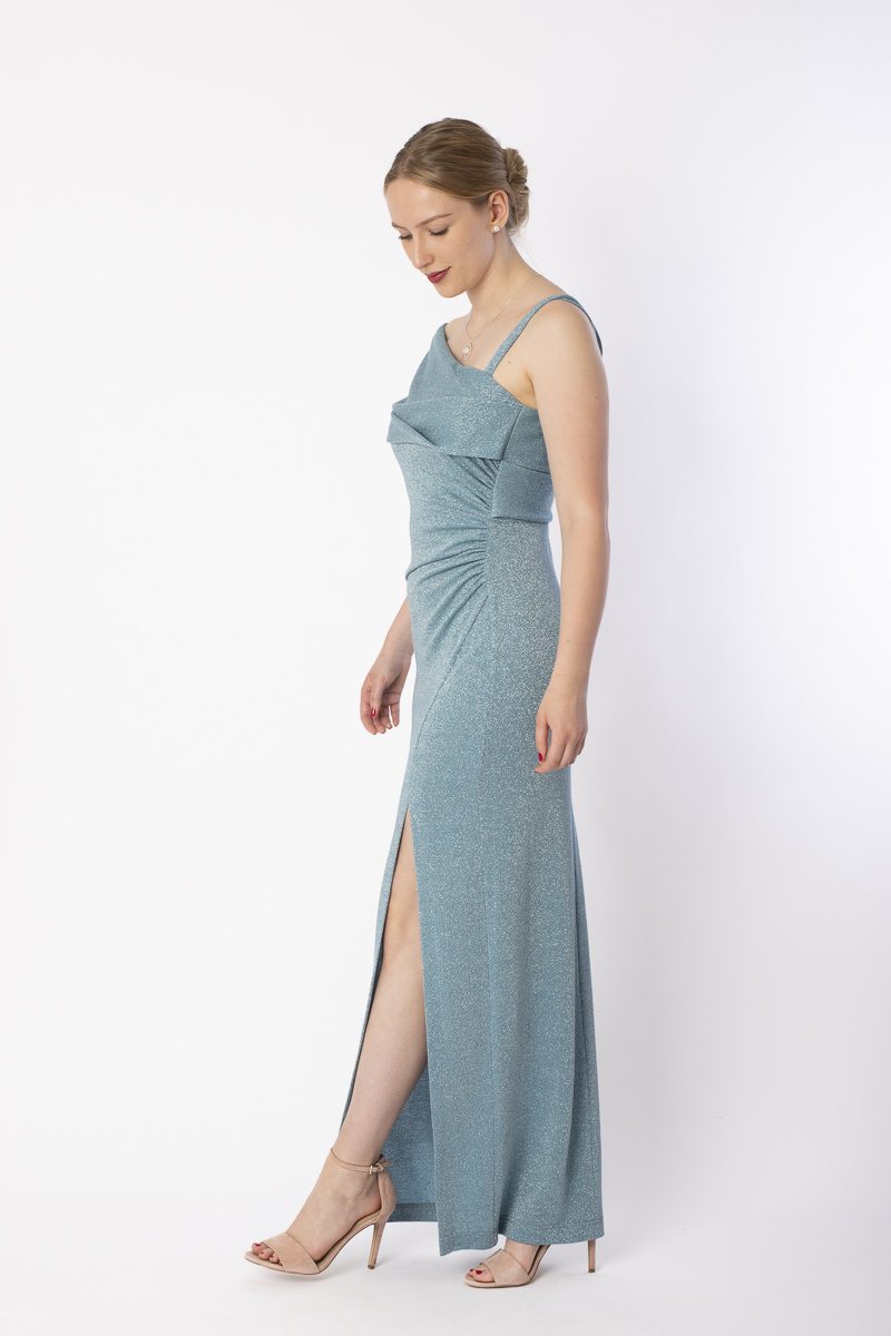 Unser atemberaubendes Abendkleid verleiht Ihnen einen souveränen und unvergesslichen Auftritt. Das extravagant drapierte Dekolleté und der hohe Beinschlitz kreieren eine asymmetrische Silhouette und setzen Ihre femininen Vorzüge gekonnt in Szene. Die seitliche Raffung kaschiert geschickt kleine Pölsterchen, während der bodenlange Schnitt die Figur optisch streckt. Und auch die Rückansicht sorgt mit ihrer Drapierung für das gewissen Etwas. Dabei kommen sowohl Figuren mit kleinerer als auch größerer Oberweite gut zur Geltung. CHIARA ist aus glitzerndem Viskose Jersey in satten Farben gefertigt und so gut wie knitterfrei.
