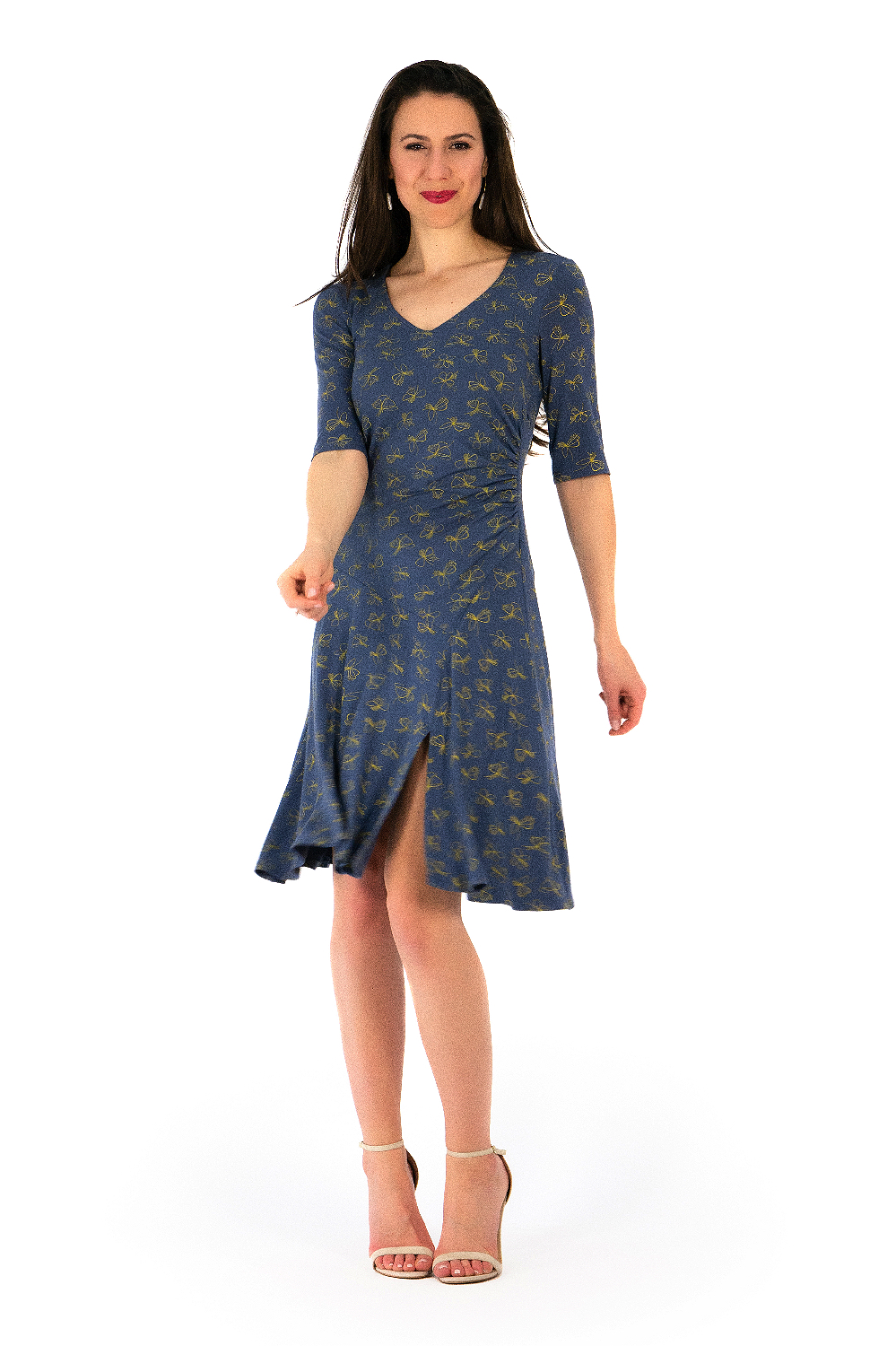 Das Rockteil ist ebenfalls dezent asymmetrisch, ein Schlitz in dem wunderbar weit schwingenden Rock zeigt in der Bewegung etwas Bein. Lebensfreude pur…!