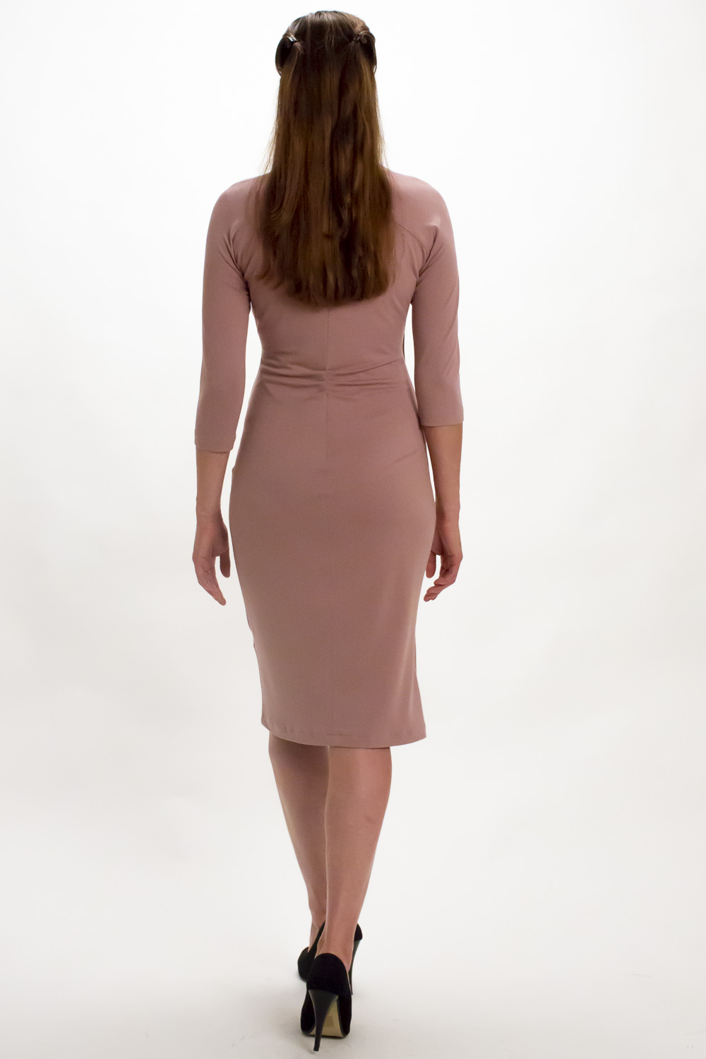 SYBILL begeistert durch aparte Wickeloptik und einseitige Raffung. Die Asymmetrie schafft eine spannungsreiche Linie, da schaut man gerne zweimal hin. Kleine Unregelmäßigkeiten werden gekonnt umspielt. Der Ausschnitt hat eine besonders schöne Form, er ist im Nacken hoch geschlossen und öffnet sich nach vorne äußerst dekorativ. Dadurch streckt er die Halspartie. Der Ärmel ist dreiviertel lang und hat eine Raglanform. Damit ist es auch für breitere Schultern sehr gut geeignet. Den Rücken ziert die Raglanabtrennung und eine kleine Raffung in der Taille.